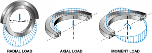 GUFEAL轉(zhuǎn)盤軸承的設(shè)計可承受較大的徑向,推力和力矩載荷,如下所示: